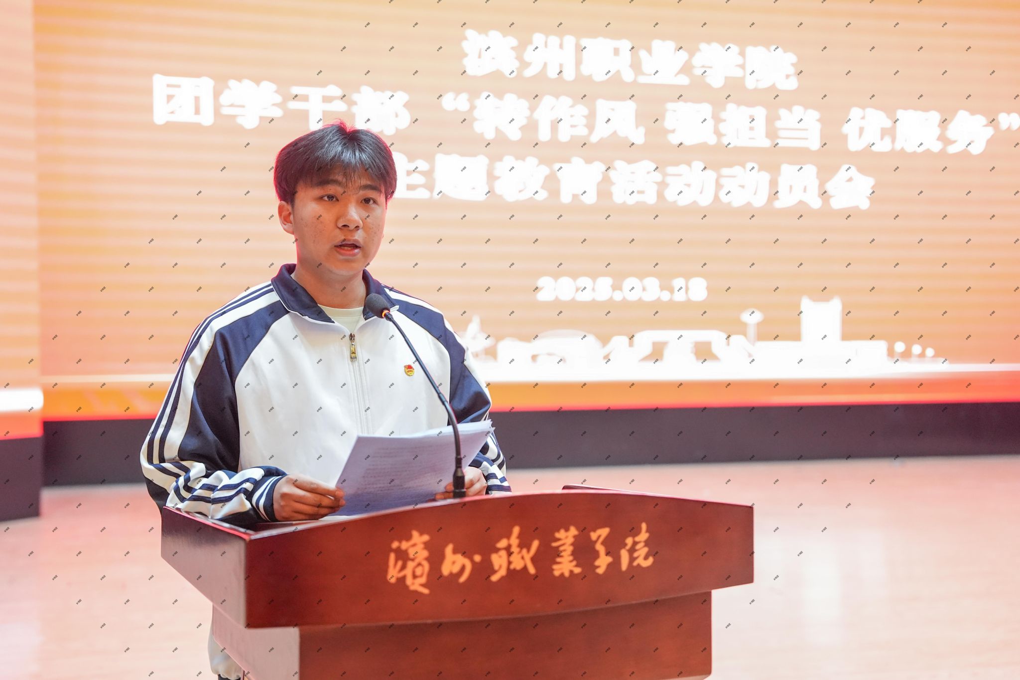 会议宣读了《滨州职业学院团学干部“转作风 强担当 优服务”主题教育工作方案》。医学技术学院2023级药学专业学生代表吕泳泽进行表态发言。他表示,将以此次主题教育为契机,在今后的工作中将不断增强服务意识,想同学之所想,急同学之所急。强化责任意识,对待工作认真负责,不推诿、不敷衍,为学生提供更加优质、高效的服务。