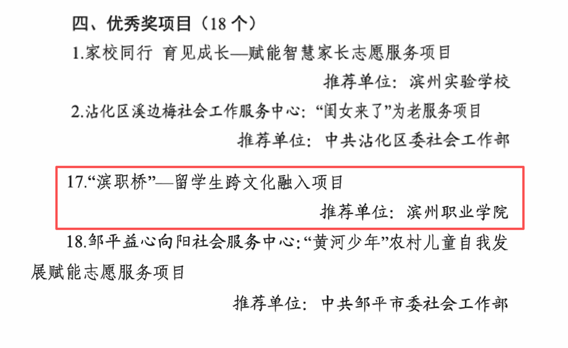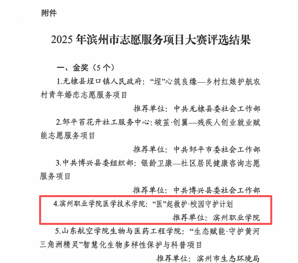 医学技术学院、国际学院讯 近日,由滨州市委社会工作部主办的2025年滨州市志愿服务项目大赛顺利举行。本次大赛经宣传发动、项目申报、项目初审、现场路演答辩、公示发布等环节,共决出金奖项目5个、银奖项目10个、铜奖项目15个、优秀奖项目18个。我校斩获金奖项目1个、优秀奖项目1个。