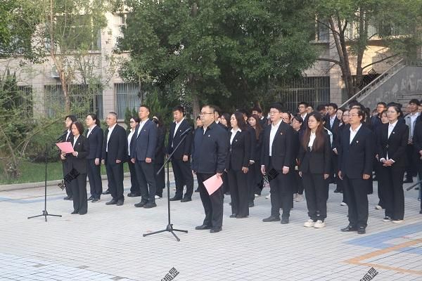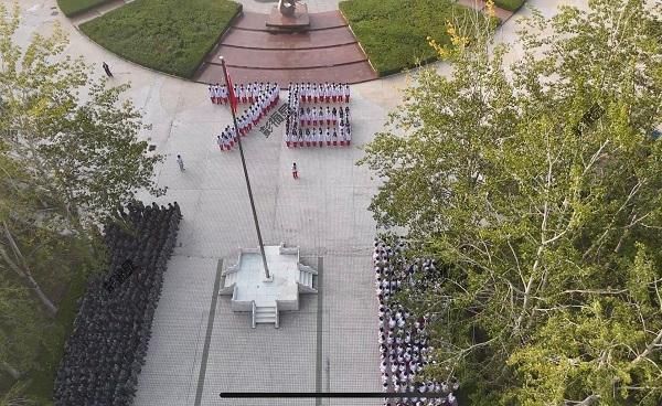 清晨的校园朝阳初升,全体师生整齐列队,注视着国旗护卫队护送五星红旗入场。在雄壮的国歌声中,鲜艳的国旗冉冉升起,全体师生齐声高唱,目光中饱含着对祖国的深切热爱与祝福。